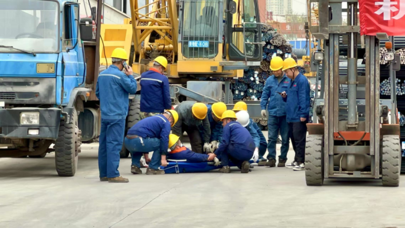 本次演練模擬鋼板區(qū)在進(jìn)行吊裝作業(yè)時(shí)突發(fā)輪胎起重機(jī)吊裝貨物擺幅過(guò)大傷人事故。演練前期,制定了詳細(xì)方案并組織培訓(xùn),籌備救援、醫(yī)療等物資,布置模擬場(chǎng)景。演練啟動(dòng)后,通訊聯(lián)絡(luò)組迅速傳遞事故信息,現(xiàn)場(chǎng)指揮組即刻啟動(dòng)應(yīng)急響應(yīng)。警戒疏散組快速隔離現(xiàn)場(chǎng)、疏散人員;應(yīng)急救援組解救受傷人員、排除設(shè)備故障;醫(yī)療救護(hù)組對(duì)傷員緊急救治并送醫(yī);后勤保障組及時(shí)供應(yīng)物資,各環(huán)節(jié)有序推進(jìn)。